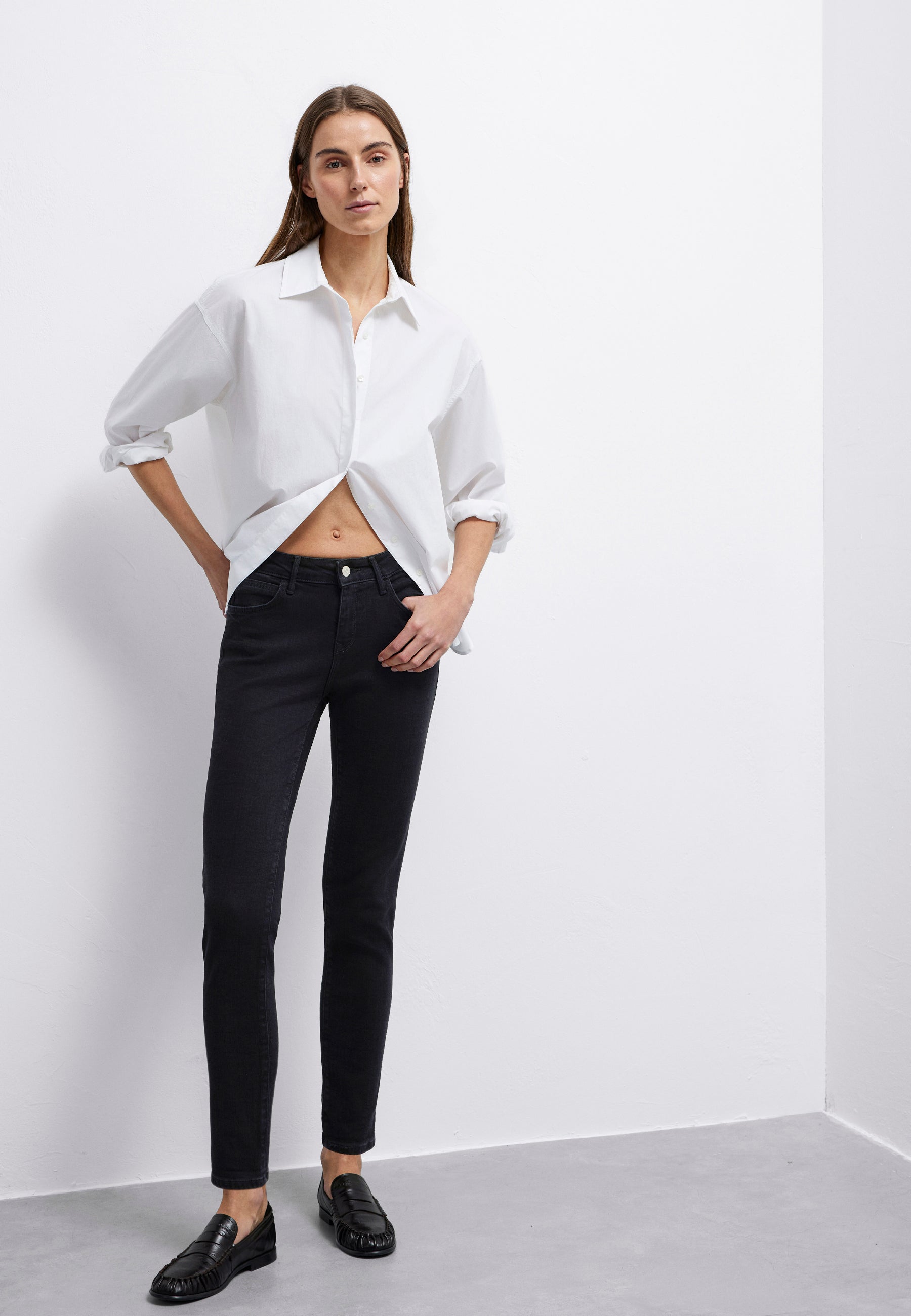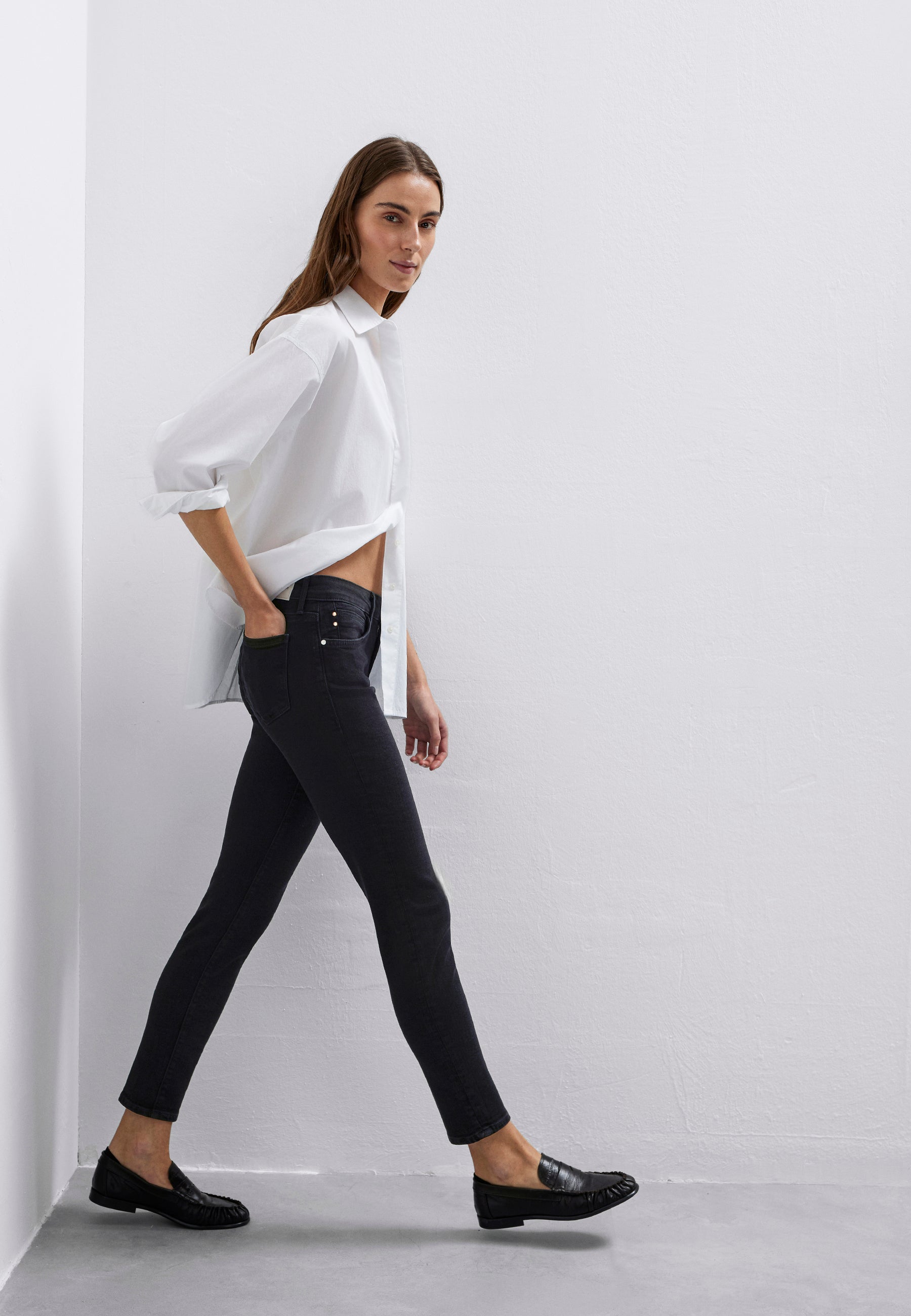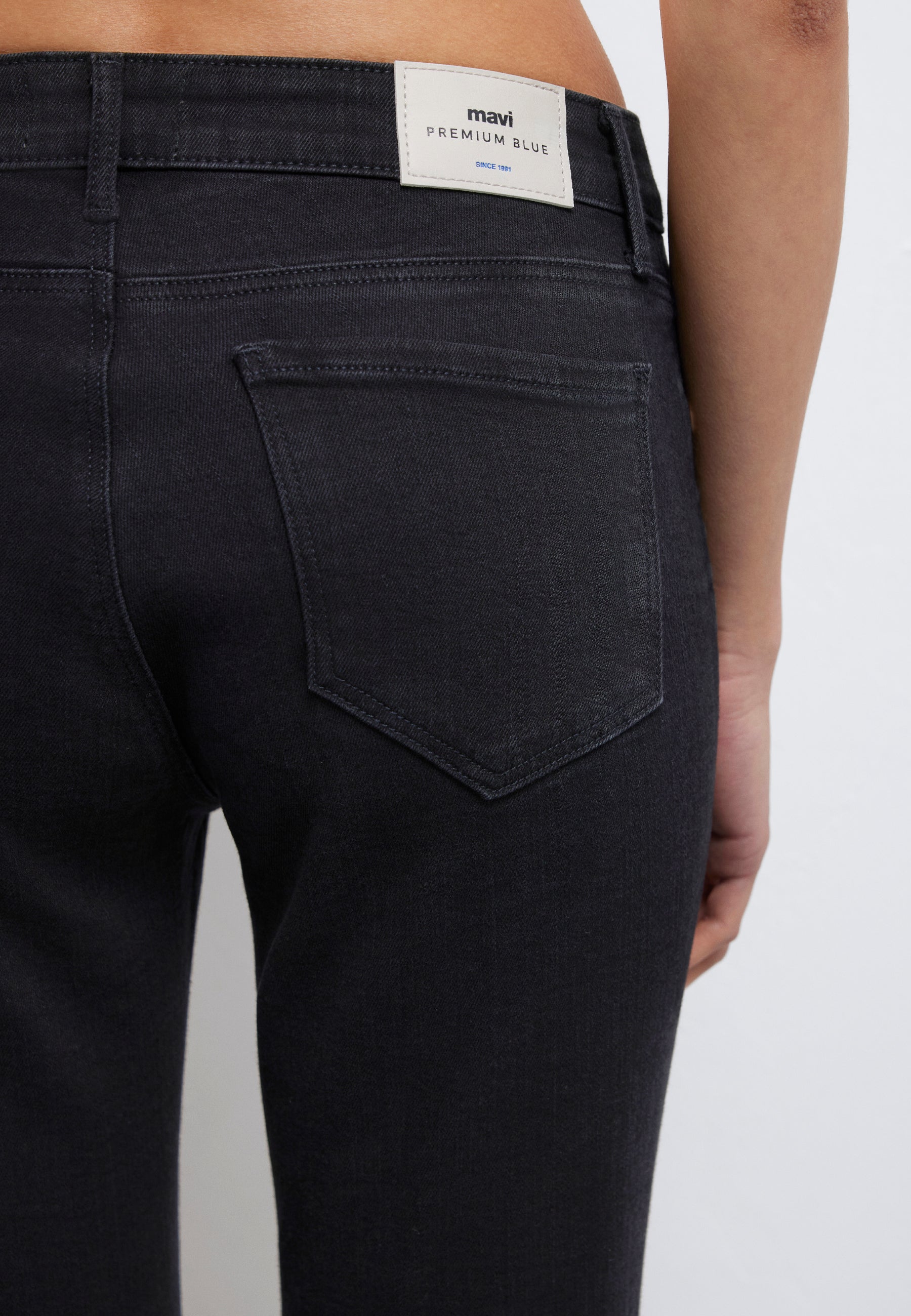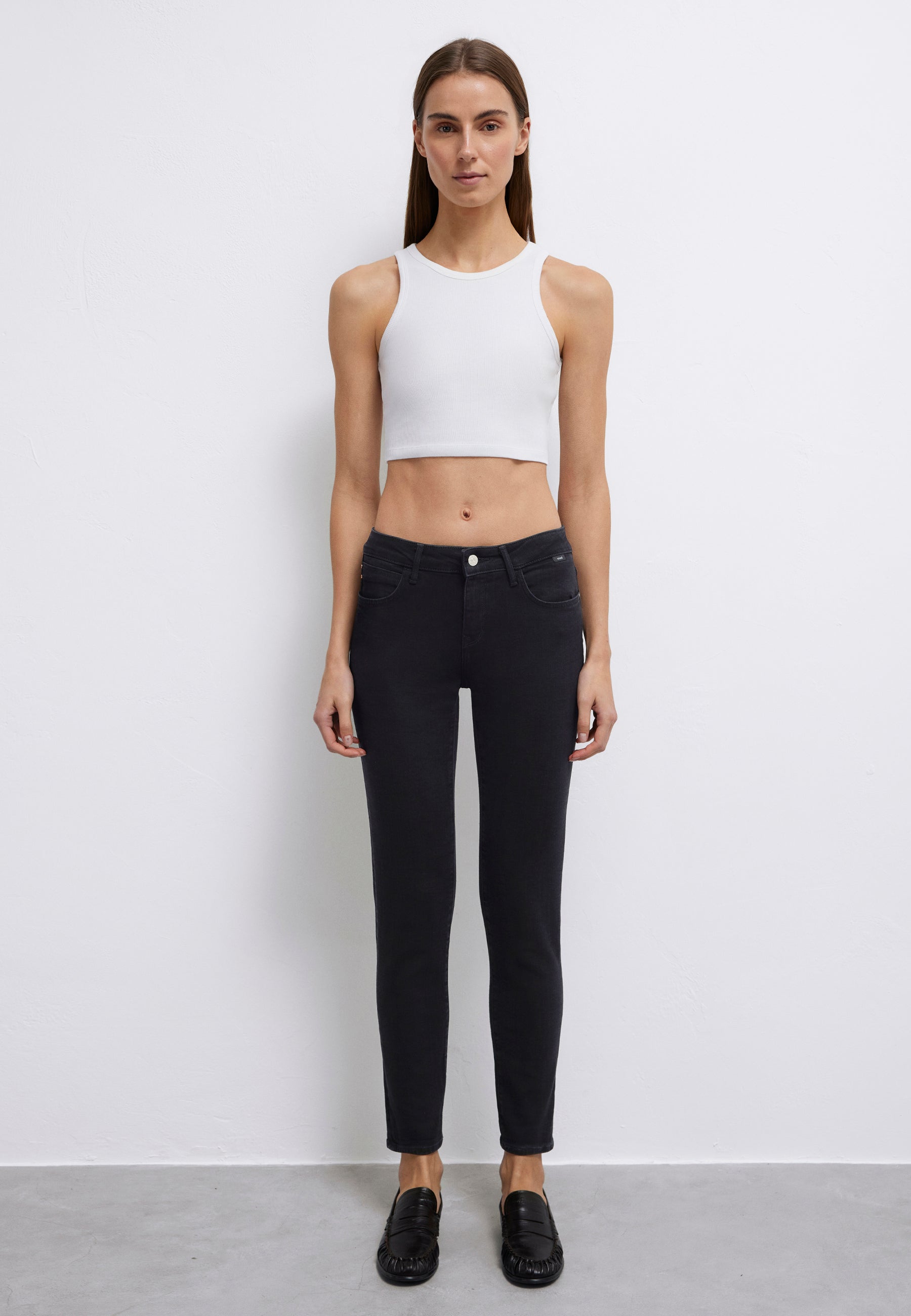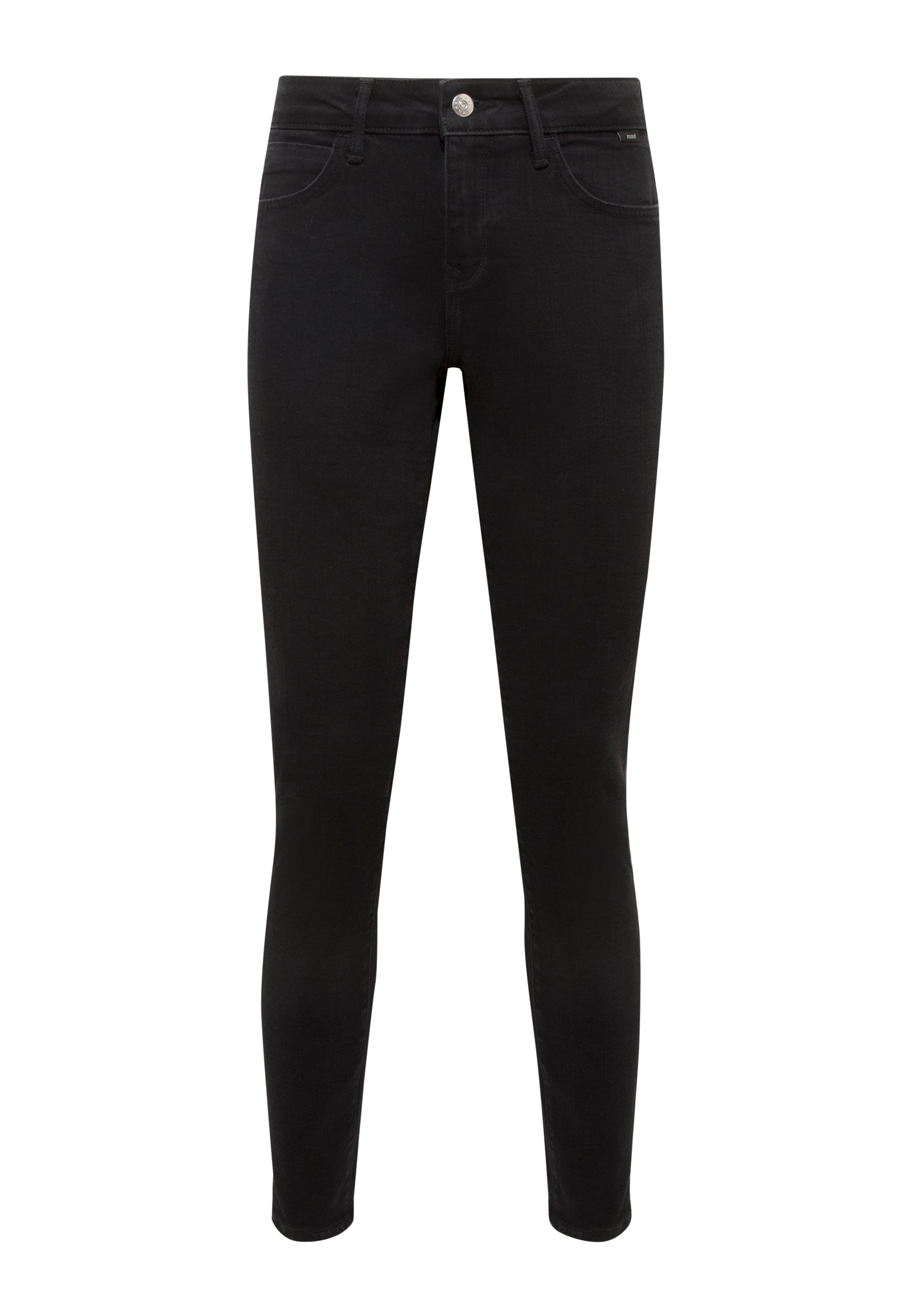 - Mid-rise waist, 5-pocket style, and zip fly